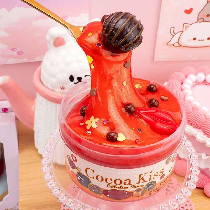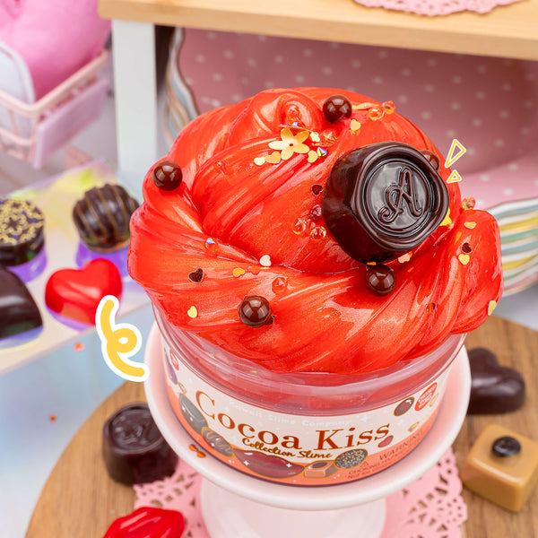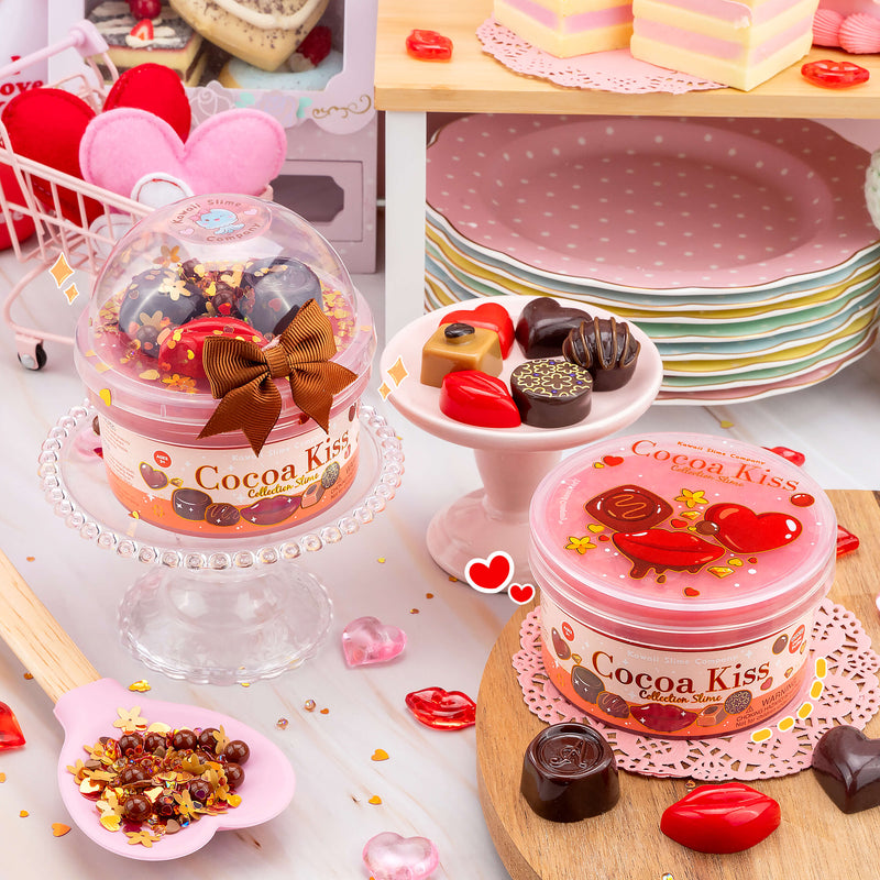 Sweeten your Valentine season with Cocoa Kiss Collection Slime, a clear Slime that shimmers with irresistible charm and a cozy white chocolate scent. Its glassy texture beautifully showcases a gold shimmer. The dome is filled with a mix of red and gold confetti and the adorable chocolate-inspired charms—like a shiny heart candy, a caramel square, and truffle-style pieces that make every swirl feel extra special.